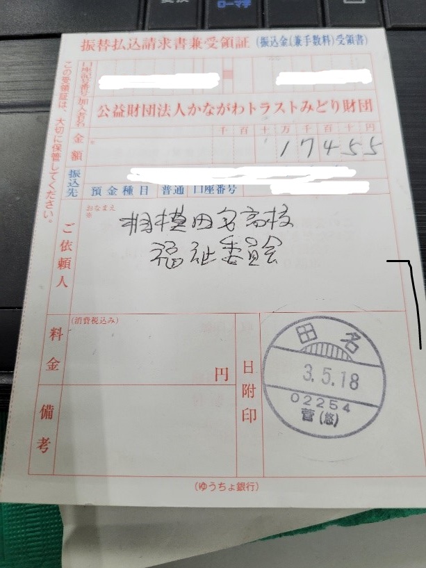 今年度のみどりの羽根の募金は17,455円集まりました。今年は各クラスルームでの募金となりました。かながわトラストみどり財団に送り、本校及びふるさとの緑化活動に使われます。