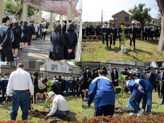 福祉委員会は今年度かながわトラストみどり財団のみどりの募金を5月と11月に実施、18110円の募金を集めました。この募金のうち9055円を学園緑化推進助成金として使わせていただくことになり、花梅の苗木と夏みかんの苗木を各1本購入し、3月15日に植樹しました。