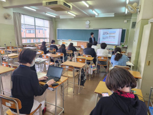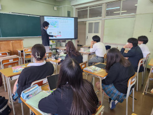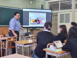 10月23日(水曜日)5・6時間目に「高校生向け脱炭素教育に係るプログラム」の第3回目を実施し、企業の2名の方から貴重なお話を伺いました。
