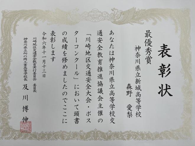新城高等学校 > 学校生活 > 新城風景 > 令和6年度 新城風景 > 美術部川崎地区交通安全大会・ポスターコンクール最優秀賞受賞!