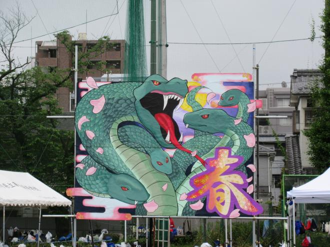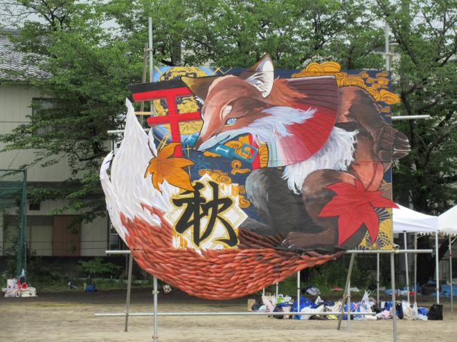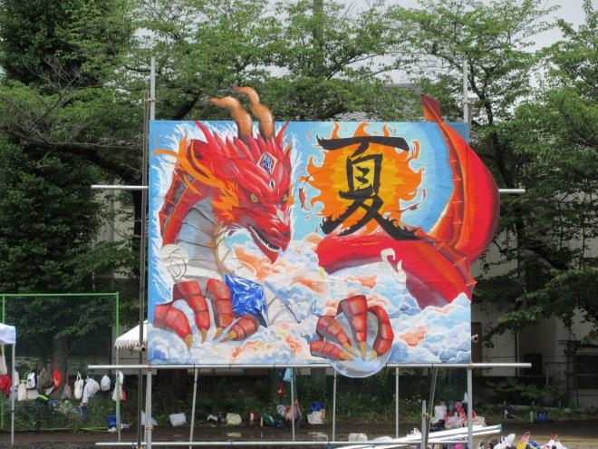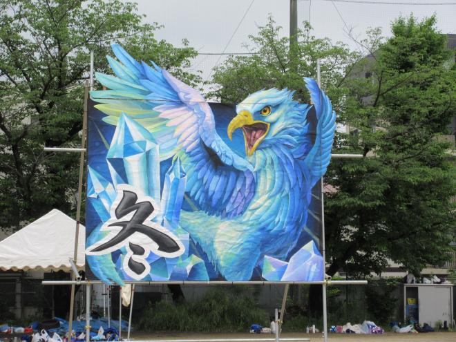 本校では、生徒の生まれ月で季節団(春組・夏組・秋組・冬組)にわかれ、体育祭を行っています。各団には団長・副団長・応援団長・副応援団長の4名の幹部がおり、それらを合わせた16名の幹部(十六幹)が先頭に立ち、応援演舞で体育祭を盛り上げています。また、迫力あるマスコット(立て看板)は各団のマスコット製作担当の生徒たちが工夫を凝らして完成させたものです。この日のために十六幹、マスコット長らを中心として入念に準備を進めてきました。