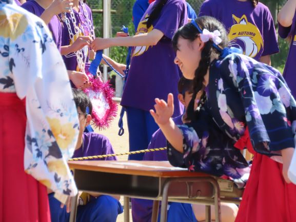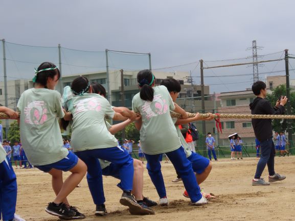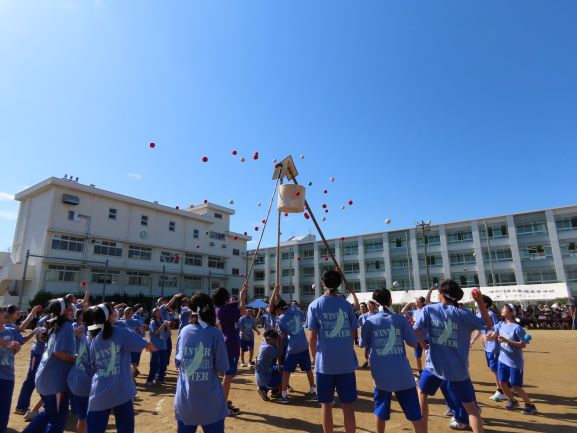 プログラムは、準備運動、棒引き、台風の目、借りもの(者)競走、綱引き、学年別クラス対抗リレー、応援合戦、部活動対抗リレー、玉入れ、騎馬戦、四季別対抗リレーなど、それぞれ熱い戦いが繰り広げられていました。