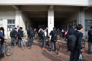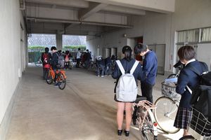 自転車通学を行う新入生向けに、説明会が行われました。全体に向けて安全講習を行った後、ブレーキや前照灯などの点検を行い、登録シールの配付をしました。自転車通学のみなさん、安全に気を付けて登下校をするようにしましょう。