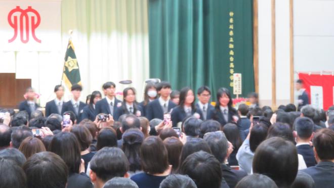吹奏楽部、野球部、合唱部による校歌披露がありました。