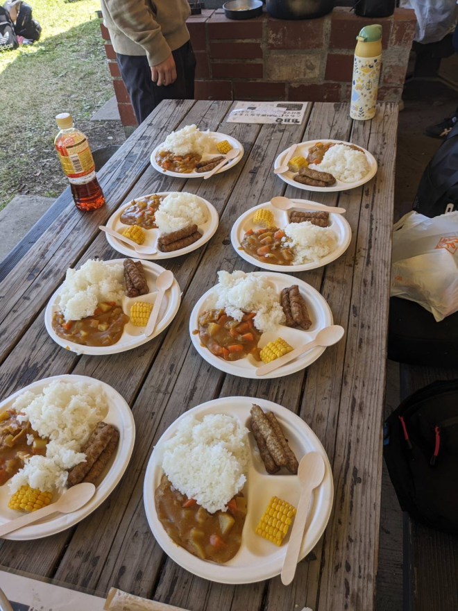 クラスで集合写真を撮った後、班ごとに別れてカレーを作りました 。 具材を大きく切りすぎて火が通らず、時間がかかった班もありましたが、メンバー同士協力して、おいしいカレーを作ることができました!