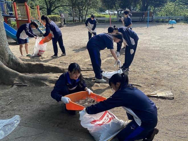 5月22日月曜日の6校時目、1年生が地域貢献清掃活動を行いました。市民センターや地域団体、PTAの方々にもご協力いただき、学校周辺通学路や近隣公園の清掃をしました。