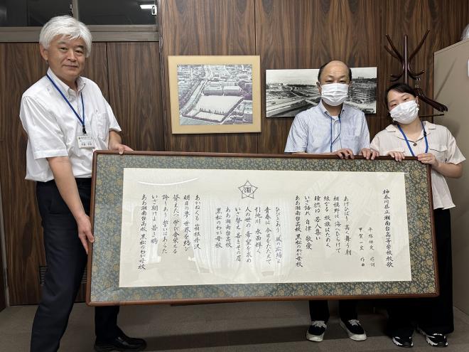 初代校長 平塚禅定 様のご家族が来校し、校歌の書を寄贈されました。
