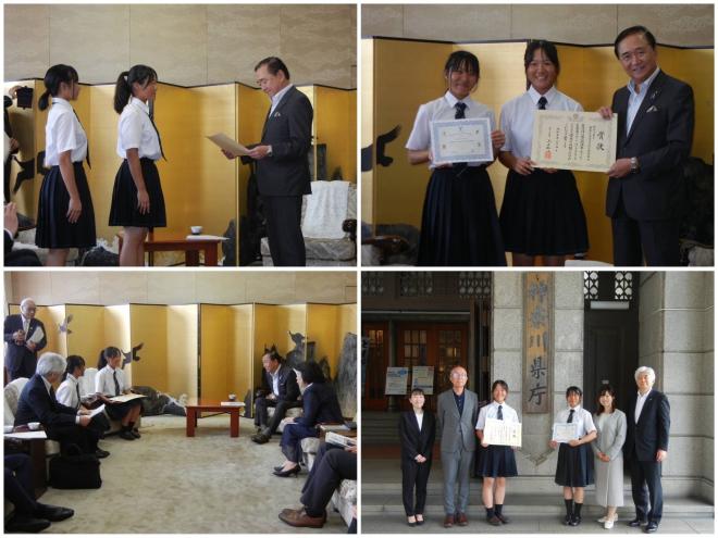 神奈川県庁本庁舎にて、横浜開港祭チャリティー吹奏楽コンサート ザ ブラスクルーズ2023神奈川県知事賞授与式がおこなわれ、吹奏楽部より、3年部長 奈良橋歩(ならはしあゆみ)さん、3年副部長 山下洸姫(やましたひろき)さんが出席し、黒岩知事から直接授与していただきました。