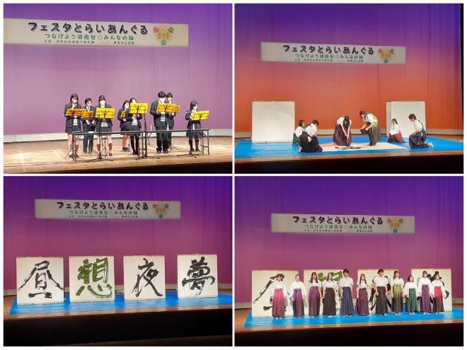 令和6年1月27日、ボランティア部、書道部、生徒会本部の役員で、第19回フェスタとらいあんぐるに参加してきました。このイベントは、湘南台地区の「子どもから大人まで、演奏や合唱、踊りなどをとおして学校・家庭・地域が交流するフェスティバル」です。ボランティア部はハンドベルの演奏、書道部は書道パフォーマンスの披露を行い、生徒会本部はプログラムの司会進行役を務めました。