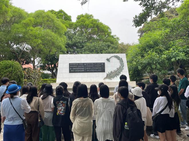 沖縄到着後、平和学習として、平和祈念公園、師範健児之塔、ひめゆり平和祈念資料館を訪れました。一人ひとりが、平和について真剣に考えている様子でした。