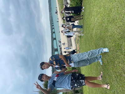 修学旅行2日目、まずは古宇利大橋へ行き、クラス写真の撮影をしました。綺麗な海と橋の大きさに驚き、撮影している生徒が多くいました。
