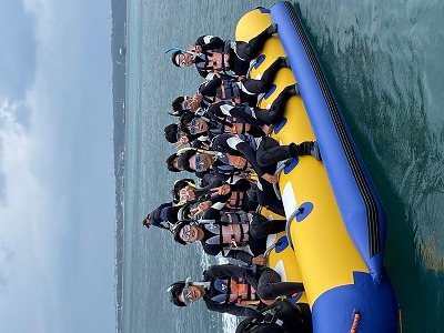 その後、カヌチャビーチへ移動し、マリンスポーツはシュノーケリング、バナナボートを、マリンクラフトはサンゴを集めて、フォトフレーム、サンゴ風鈴作りをしました。