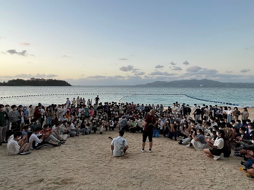また、ホテル到着後はビーチへ移動し、クラス写真の撮影や旅行係が計画してくれたレクレーション「王様ドッジボール」を行いました。また、教員による三線ライブやダンス部による発表もあり、大いに盛り上がりました!