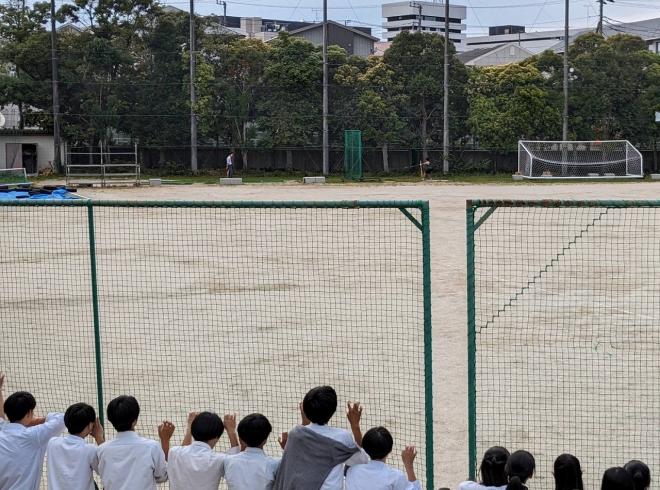 3年生はその後、ハンマー投げの実演を観賞しました。安全確保のため、間近での観賞ではありませんでしたが、同級生、学年の先生たちが見守る中で堂々とした投げっぷりでした。
