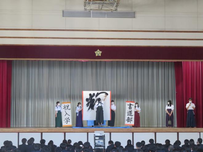 書道部は曲に合わせて演舞し、「昼想夜夢」「邁」の字を揮毫しました。部が日々活動する中で考えていることを文字に表しました。「この言葉を胸に、これからも精進してまいります」というお話が印象的でした。