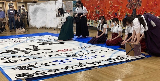 試作を何回も行って、練習してきた成果をみなさんの方々の前で発表する機会をいただけたことは、書道部員にとって大変嬉しいことでした。完成した作品は、数日間アートスクエアに展示され多くの方々にご覧いただきました。(※著作権については確認しております。)
