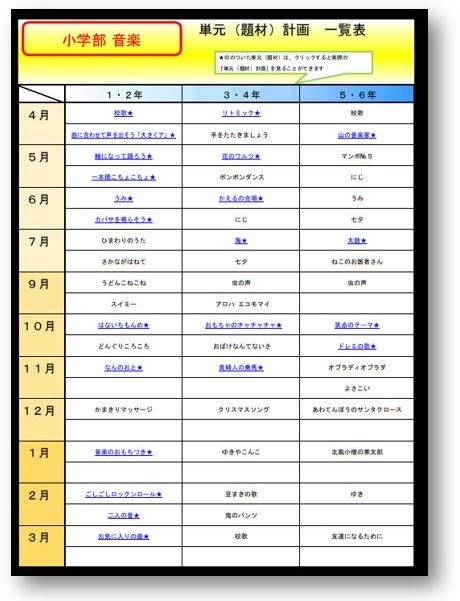 ここでは、図工・美術の《一覧表》と、各学部の『単元(題材)計画』を各1枚、掲載いたします。
