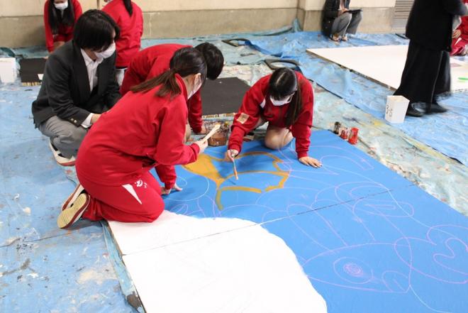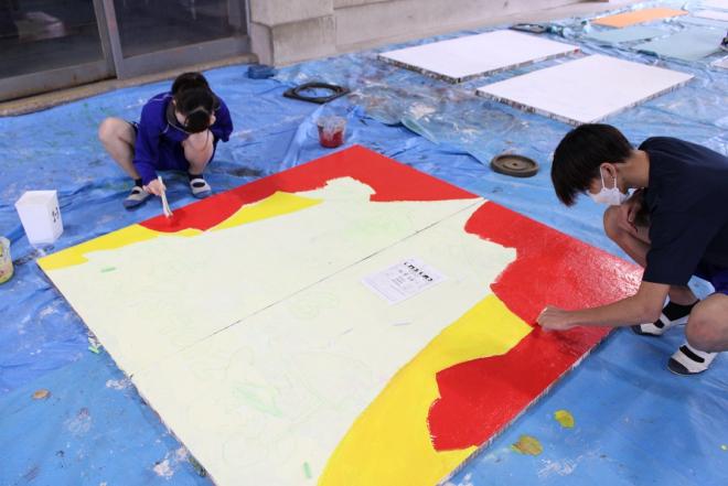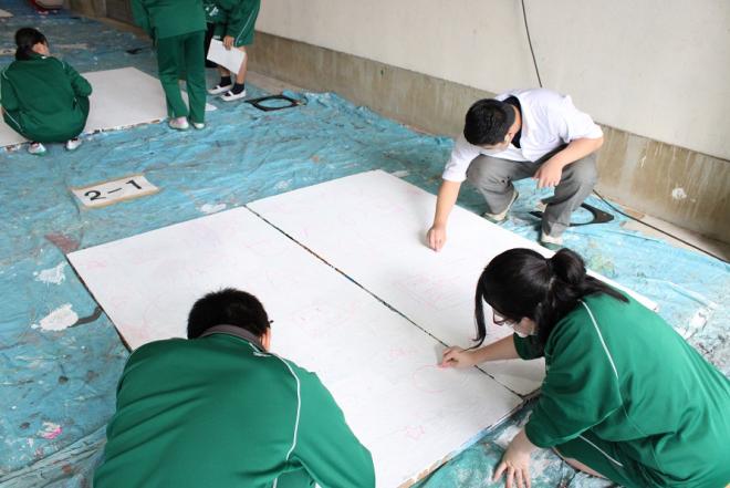 本日は、パネル作成の様子をご紹介します。紅葉祭では、各クラスの企画について、180cm×180cmの大型のパネルで案内板を作成します。各クラスのパネル係がデザインを考え、下塗り、着色を行っています。完成したパネルは、当日中庭に展示されますので、ぜひご覧ください。