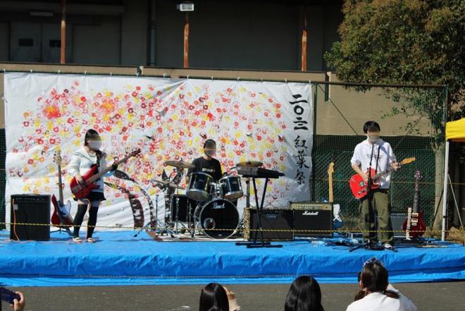 紅葉祭2日目の様子をご紹介します。2日目は、在校生の保護者、中学3年生とその保護者限定の一般公開を行いました。中庭ステージでは、軽音楽部、書道部、有志団体の発表が行われました。来場者がいたこともあり、昨日よりもさらに盛り上がりが見られました。
