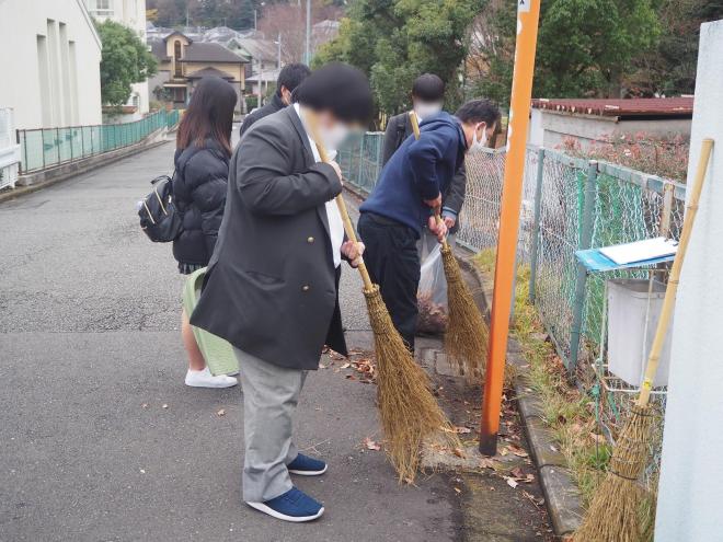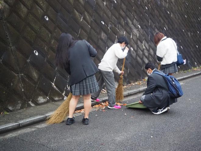12月6日(火曜日)に地域貢献デーとして、放課後に保健委員と有志生徒による学校近隣の清掃を行いました。生徒たちは一生懸命落ち葉を拾い、通学路がきれいになりました。