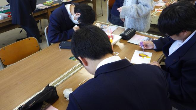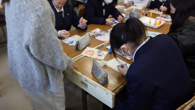 1学年美術Ⅰでは1月28日(火)ディンプルアート普及協会の岩本李菜先生、高見澤かおり先生を講師としてお招きし、ディンプルアートを学びました。自動車の廃材を捨てることなく利用した絵の具で着色をしてキーホルダーを制作しました。SDGsのテーマであるゴミを減らす取組を考えながら作品を制作しました。