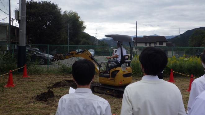 地域の緑地環境を整備する職業を学ぶため(株)田口園芸様にご指導のもと、建設機械の操作を体験しました。直接機会に触れる機会をいただきました。