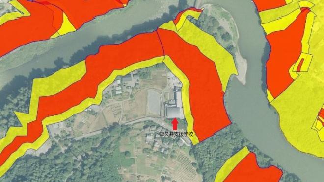 【学校周辺航空写真地図】校舎の一部は土砂災害警戒区域の中にあります。