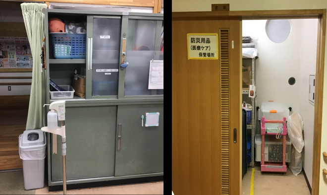 さらに肢体不自由部門の児童生徒用に、電動吸引器や充電器台、吸引器付属チューブ、手動吸引器、吸入器、折り畳みテーブル、防飛沫シート、折り畳みカート、各児童生徒の災害時ケア物品、吸引カテーテルを備えています。