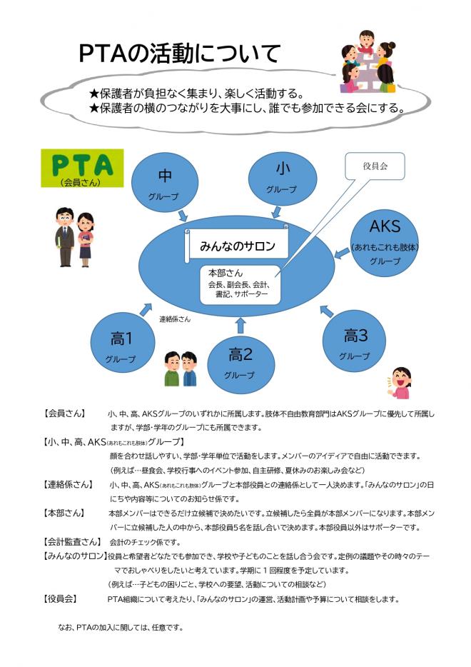 本校のPTAの目的は、「保護者と教職員が協力して、児童・生徒の健全な成長を図ること」です。