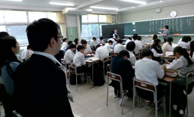 多くの方にお越しいただいたため、会場を2つに分けて説明会を行いました。高校の教室や授業も見学してもらいました。