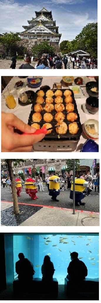 天気予報は雨でしたが、大阪に到着すると雨は止んでいました。1日目は大阪城へ行きました。天守閣最上階まで階段を上り、疲れた表情も景色を見ると笑顔になり「すごい!」と盛り上がっていました。