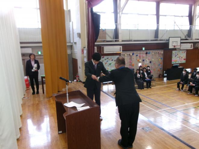離退任式では本校を離退任する職員の紹介がありました。卒業した3年生や保護者も数名来て花道を作って送ってくれていました。とても温かい気持ちになりました。