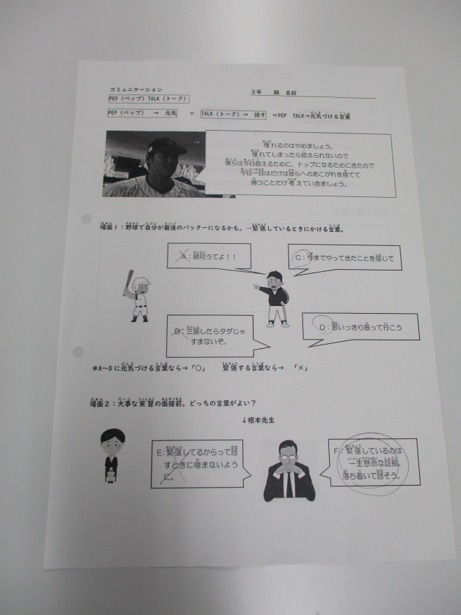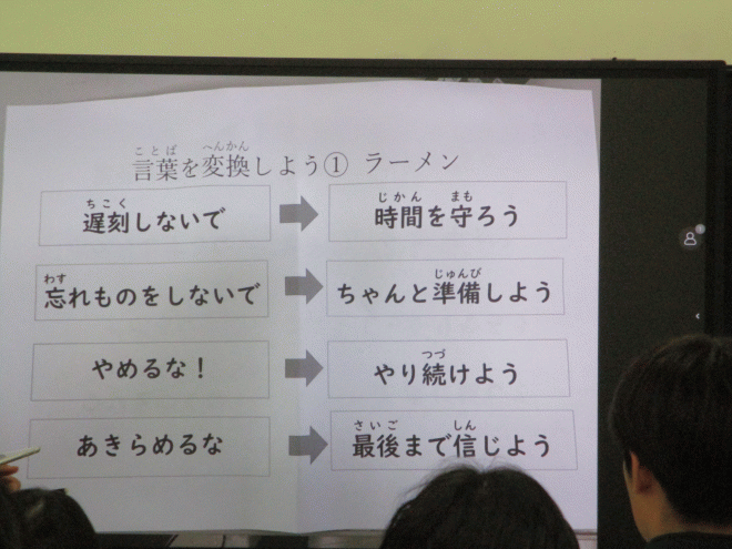 3年生はコミュニケーションの時間に、「ペップトーク」で相手を元気にする言葉かけを学んでいました。グループに分かれて具体的な場面での前向きで元気になる言葉を考えていました。素敵な言葉がたくさん見つかりました。