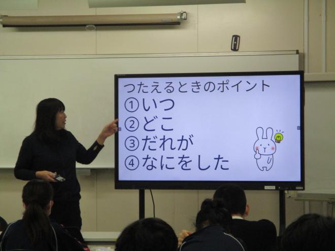 「⓵いつ」「⓶どこで」「⓷だれが」「⓸なにをした」というような他の人に状況を説明する場合に、分かりやすい言葉の使い方を学習をしています。例えば、「いつ」→昨日、「どこで」→グラウンドで、「だれが」→A組が、「なにをした」→ドッジボールをした、と⓵から⓸の言葉を意識して説明すると、とても分かりやすく相手に伝わります。