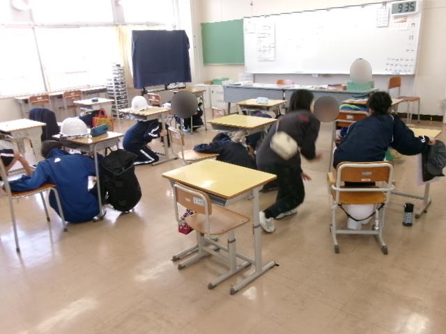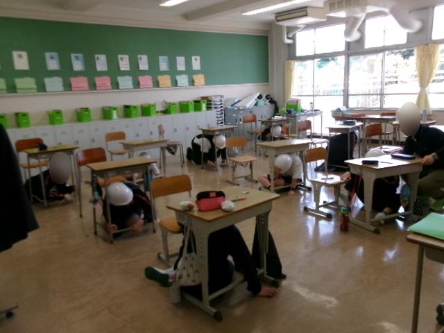 1年生の教室では、「姿勢を低くし、机の下などの安全な場所で身を守ってください」というアナウンスに従い、ヘルメットをかぶり机の下にしっかりと身をかくしていました。皆さん、とても落ち着いて行動できていました。いつでも、どこでも、災害は突然やって来ます。まずは、自分の身を守ることを学びました。
