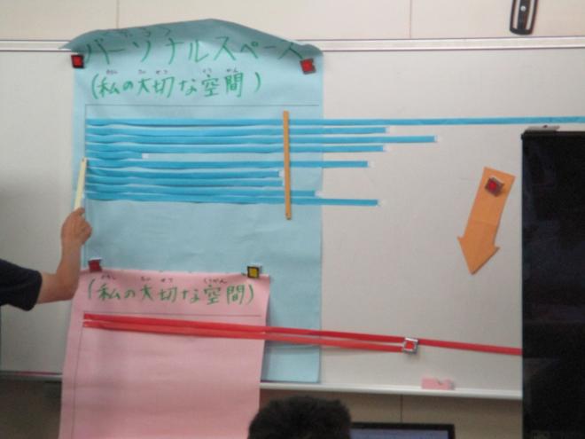 コミュニケーションの授業では、パーソナルスペースについて学んでいました。電車の座席のどこに座るかというアンケートを行っていたり、男子と女子に分かれて、お互いが安心感を保てる距離を実際に計測したりしました。平均すると85センチくらいあると安心感を保てる人が多かったです。