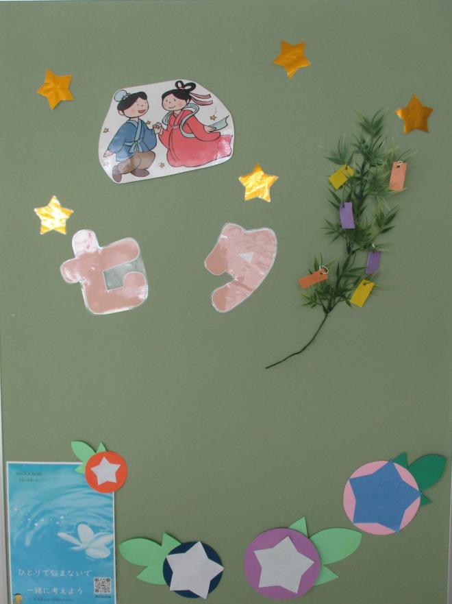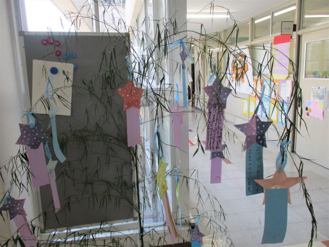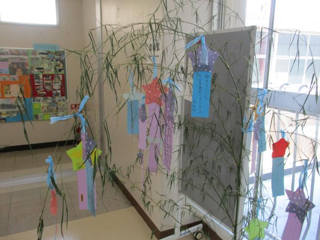 各学年の廊下に、近隣のご協力によりいただいた笹を飾っています。3年生の短冊が一番多く飾り付けられていました。来週月曜日が七夕です。給食も七夕にちなんだ献立になっています。乞うご期待を。