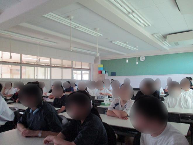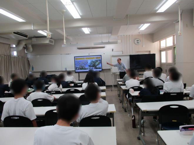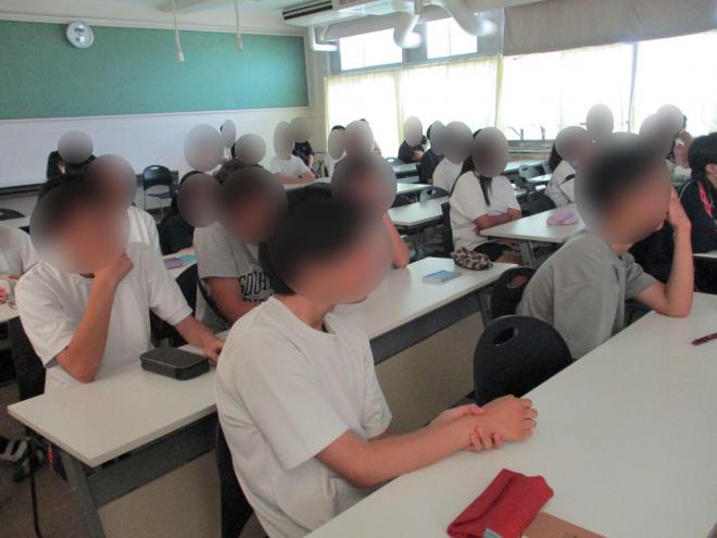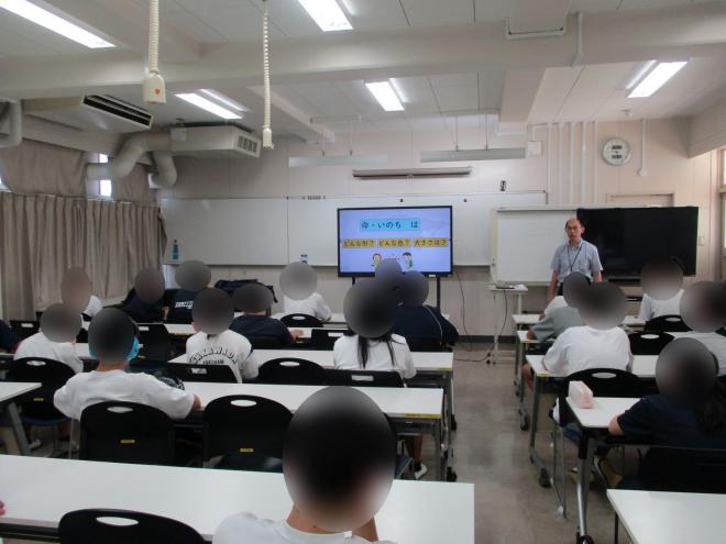 本日、1年生を対象に45分間の講話を行いました。現在と過去の日本と世界の様子をおり混ぜながら、命の大切さについて伝えました。後半には、アニメ「めぐみ」と沖縄慰霊の日の小学生の朗読を視聴し、最後に、「自分も大事、相手も大事、みんな大事」という生徒へのメッセージでまとめました。