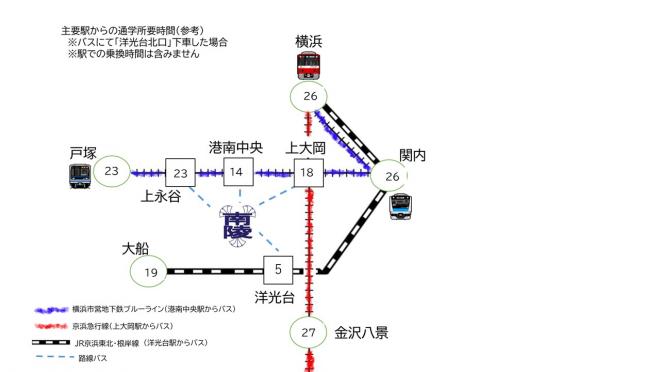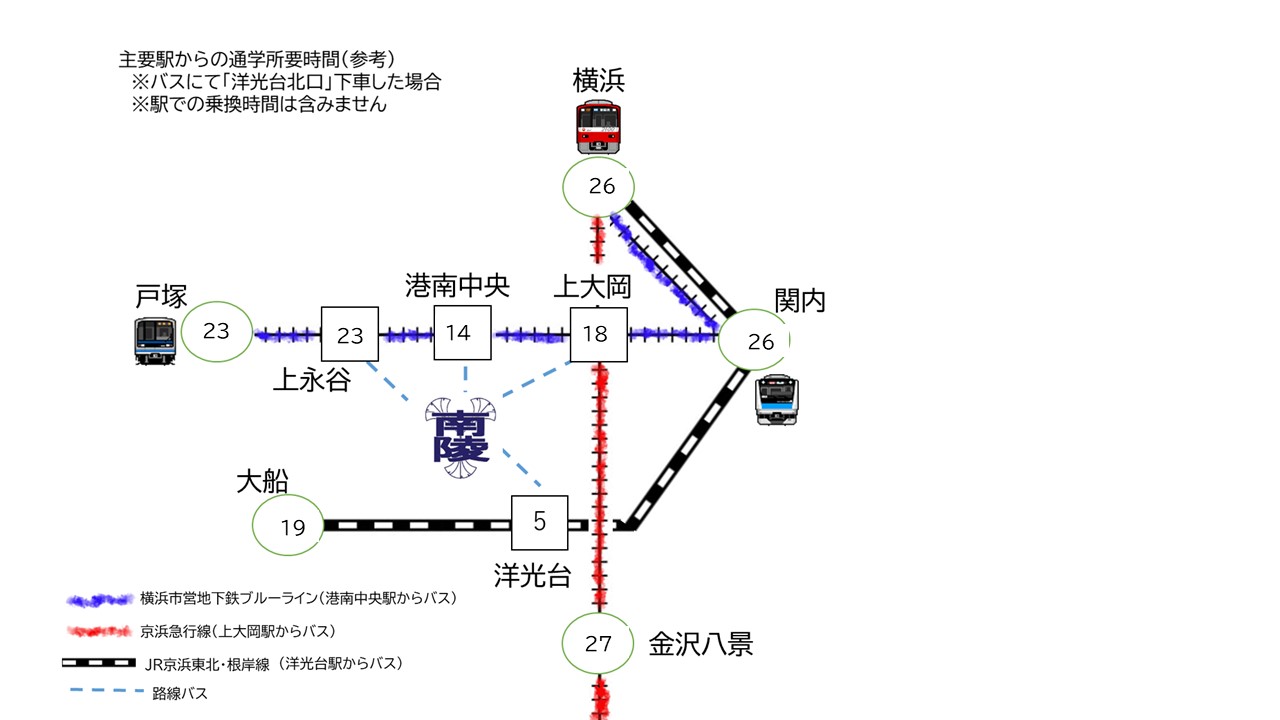 ※上大岡駅から本校方面へ向かうすべてのバスは「横浜市営地下鉄ブルーライン港南中央駅(港南区総合庁舎前)」経由です