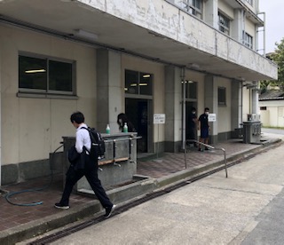 ○校舎に入る前に手洗いを呼びかけます。