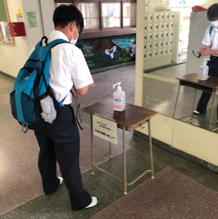 ○生徒棟の出入り口では手のアルコール消毒をします。