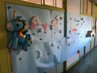 ↑(1年生の学年企画) 担任の先生の顔を描きました。たくさんの票を集めたクラスは表彰されました!