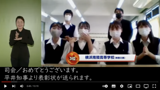 10月3日(日)に、第8回全国高校生手話パフォーマンス甲子園がweb上で開催され、本校社会福祉部が3位に入賞しました!本大会4度目の出場で初の入賞となり、部員全員で喜びました。コロナ禍で部活の活動が制限されており、3学年そろっての練習もなかなかできない中で、各自が家で手話や台詞の練習をしたり、全員が集まれる日は集中して演技の練習に取り組んだりしました。インストラクターの小島先生の指導のもと、「手話の魅力を広める」をテーマに部員全員一丸となって頑張った結果となりました。