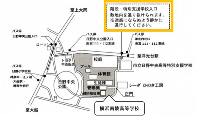 バス停から本校までの道順はアクセスの学校周辺地図をご覧ください。