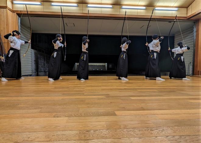 「正射必中」「凡事徹底」をモットーに、日々練習を積み重ねています。射技はもちろん、体配(弓を引く前後の所作)や日常生活も大事にしています。また部内戦や他校との練習試合も積極的に行っています。中学時代運動部だった部員も文化部だった部員もいますが、大会ではどちらも活躍しています。