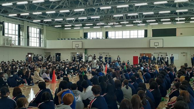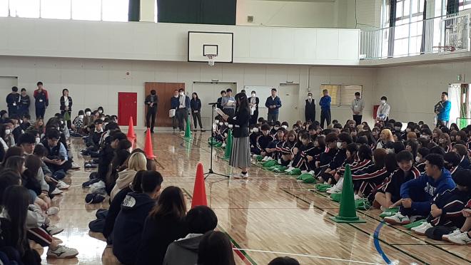 4月8日(月曜日)に、対面式がおこなわれました。体育館に1~3年次が集まり、初めての1年次と2,3年次の顔合わせとなりました。1年次が緊張しているなか、生徒会長の言葉から始まり、その後、1年次の生徒の言葉、生徒会本部役員と生徒会活動の紹介となりました。
