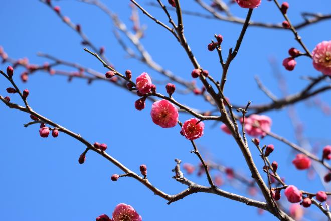 ウメ(紅梅)は昨年とほぼ同じ時期の2月中旬に開花しました。ウメは気温に影響されなかったようです。