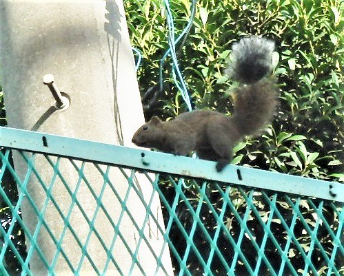 24日に学校近くを歩いていたところ、木立の中をタイワンリスが動く姿を目撃しました。こちらを警戒してか、なかなか枝付近から動き出しませんでしたが、しばらく待っているとフェンスを伝わって移動を始めたところを写すことができました。