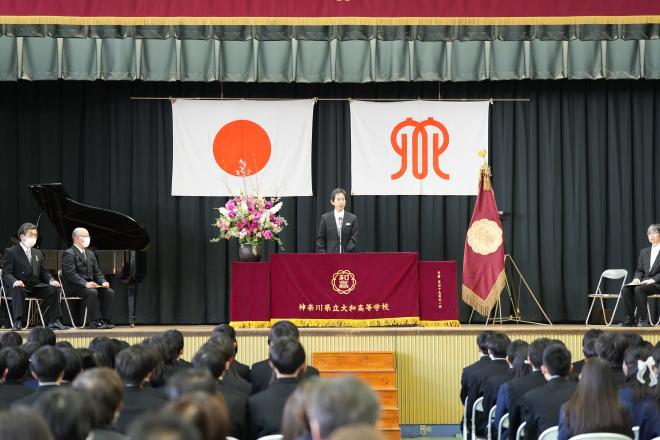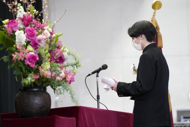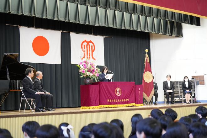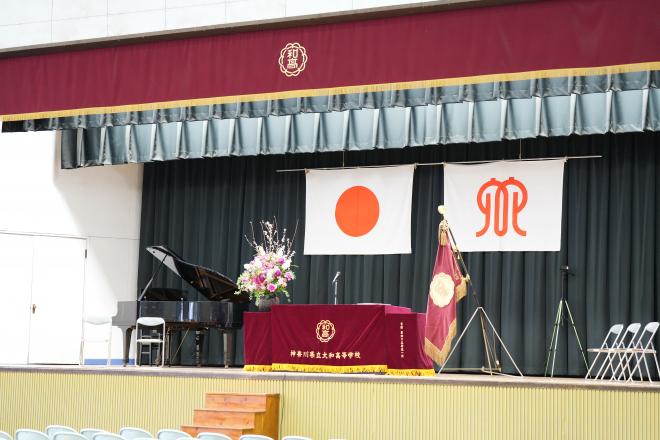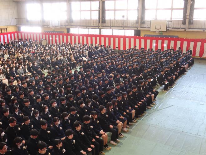 今年度は、新型コロナウイルス感染症の5類感染症への移行を受け、卒業生による合唱や、吹奏楽部による入退場時の演奏等、新型コロナウイルス感染症流行以前の内容に近い卒業式となりました。