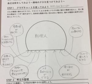 前回に引き続き、シンキングツールのひとつである「クラゲチャート」を用いて考えの整理方法を実践しました。クラゲチャートは、下の図のようにクラゲの頭の部分に考えを書き入れ、そう考える理由をクラゲの足として書き出し、考えの根拠を明確にするツールです。今回は憧れの職業をトピックとし、なぜ自分がその職業に憧れを抱くのかという理由を明確にすることで自己分析を行いました。